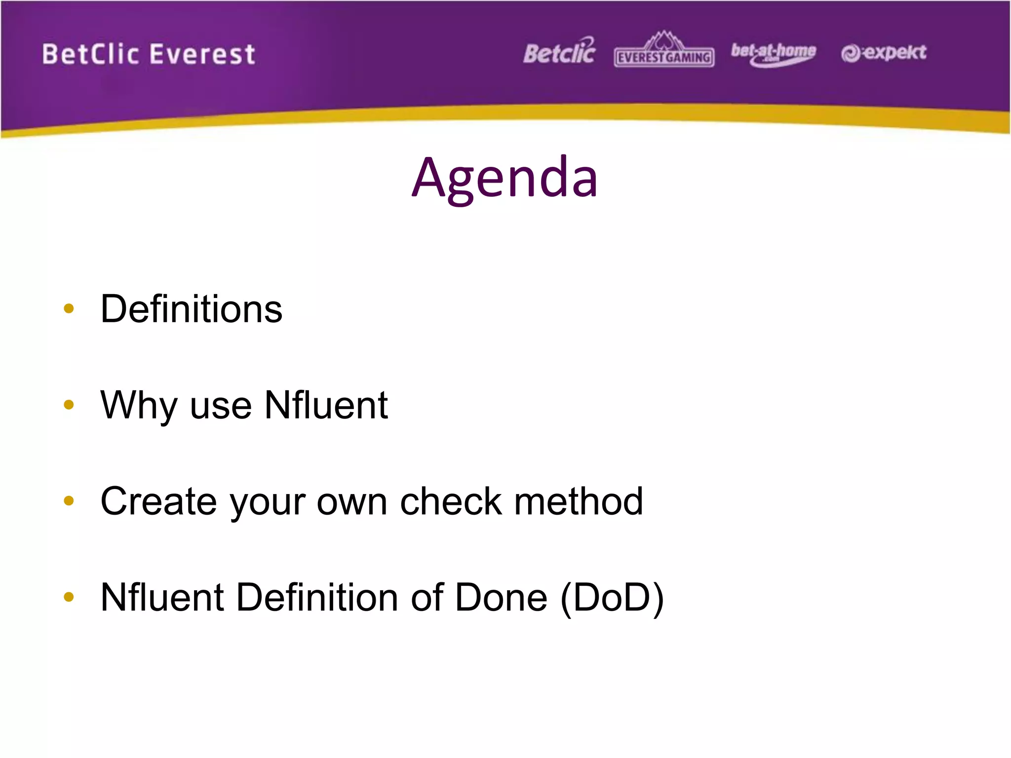 This document introduces Nfluent, an ergonomic check library for .NET TDD that aims to make tests more fluent to write, read, and troubleshoot. It discusses how Nfluent provides auto-completion of available checks, clear error messages, and the ability to create custom check methods. The document also presents Nfluent's definition of done.