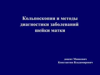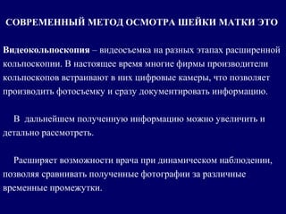 Документ описывает метод кольпоскопии и диагностики заболеваний шейки матки, включая современные техники, такие как видеокольпоскопия, и классификацию зоны трансформации по международным стандартам. Обсуждаются особенности кольпоскопической картины, метаплазия, а также важность дополнительных лабораторных исследований, таких как жидкостная цитология и последствия ВПЧ. Упоминается значимость автоматизированного скрининга и диагностики для улучшения точности и качества методов тестирования.