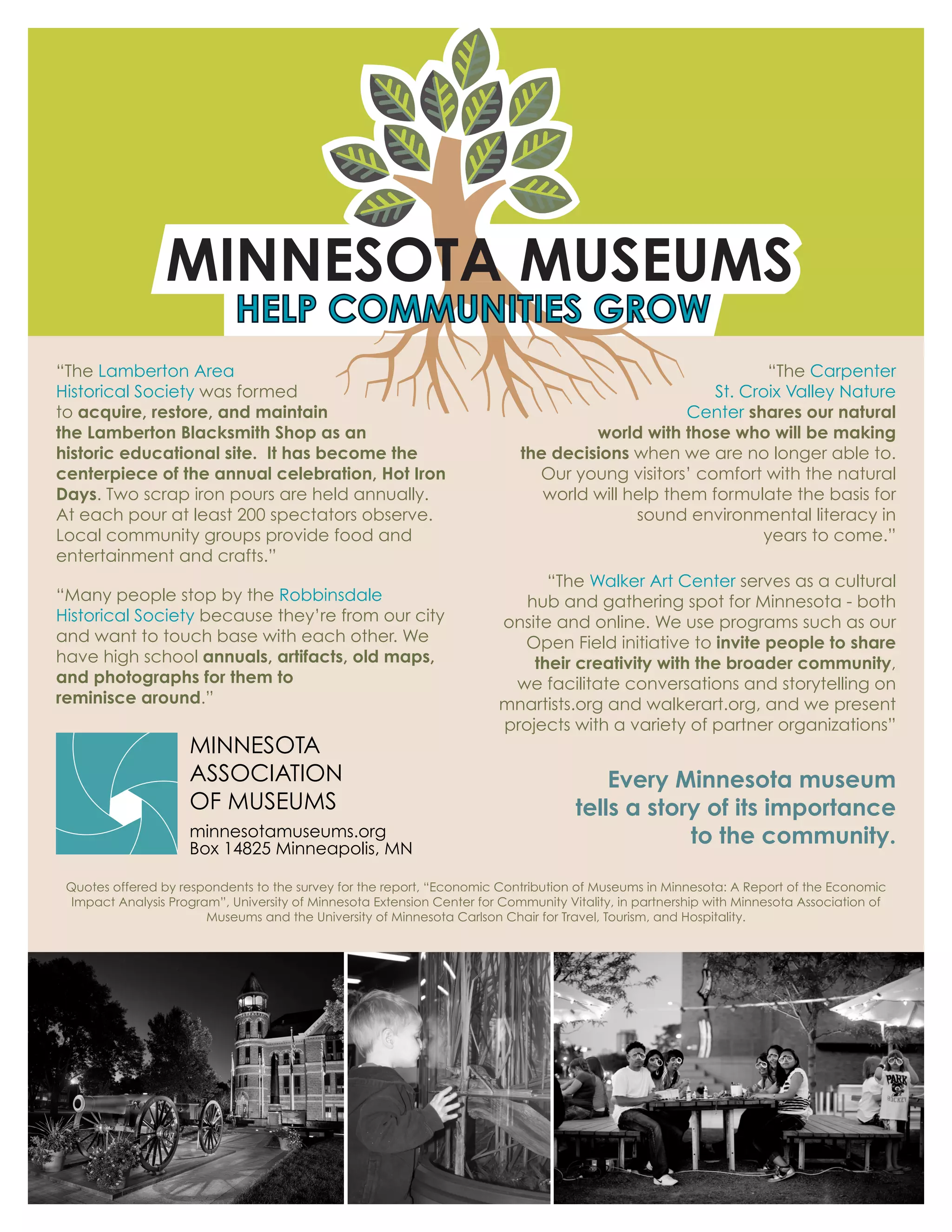 The document discusses several Minnesota museums and their importance to local communities. The Robbinsdale Historical Society allows people to reconnect with their hometown through historical artifacts and photographs. The Carpenter St. Croix Valley Nature Center educates young visitors about the environment to promote environmental stewardship. The Lamberton Area Historical Society preserves the local blacksmith shop and holds annual events that attract hundreds of spectators. The Walker Art Center serves as a cultural hub and facilitates creative sharing and conversations through various programs.