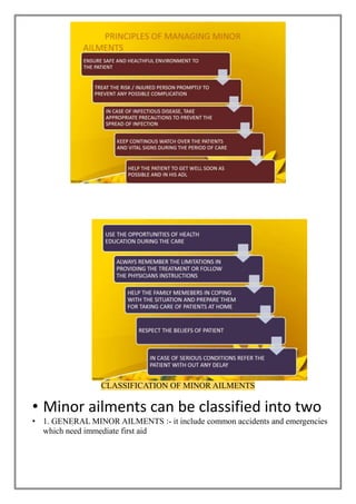 This document provides guidelines for community health nurses on managing minor ailments. It defines minor ailments as conditions that typically resolve on their own, such as fever, cough, diarrhea, skin rashes, and animal bites. The document classifies minor ailments and outlines the assessment, diagnosis, treatment, and evaluation process for common minor conditions. It also discusses standing orders, which allow nurses to provide initial treatment for minor illnesses and emergencies in the absence of a doctor. Specific treatment guidelines are provided for managing conditions like fever, burns, snake bites, fainting, and earache.