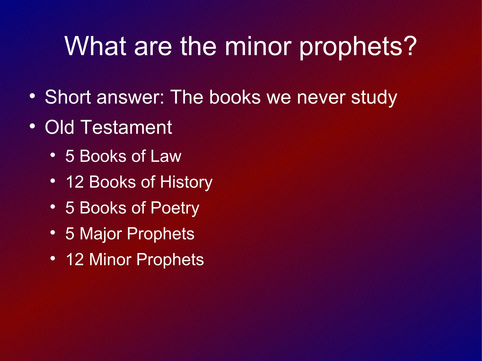 The document discusses the minor prophets of the Old Testament. It defines them as the 12 shorter prophetic books that are often overlooked compared to the major prophets. It provides background on some of the individual minor prophets, such as their occupations and the historical time periods they prophesied. While called "minor," the document emphasizes they were not minor in importance or message. It encourages studying the minor prophets because they are part of God's word, quoted in the New Testament, can teach from history, and show how God has acted and will act.