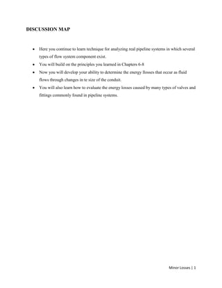 This document discusses techniques for analyzing energy losses in pipeline systems that contain components like valves, fittings, and changes in pipe size. It begins by introducing the concept of minor losses, which are energy losses caused by components other than pipe friction. Methods are provided for calculating the energy loss associated with specific minor loss elements like sudden pipe enlargements using resistance coefficients. The document lists learning objectives and provides examples of calculating minor losses for water flowing through a pipe enlargement.