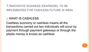 1. Implementing a cashless payment system in India using pre-paid cards, point of sale systems, internet banking, mobile banking, and payment apps like Paytm to increase transparency and GDP.