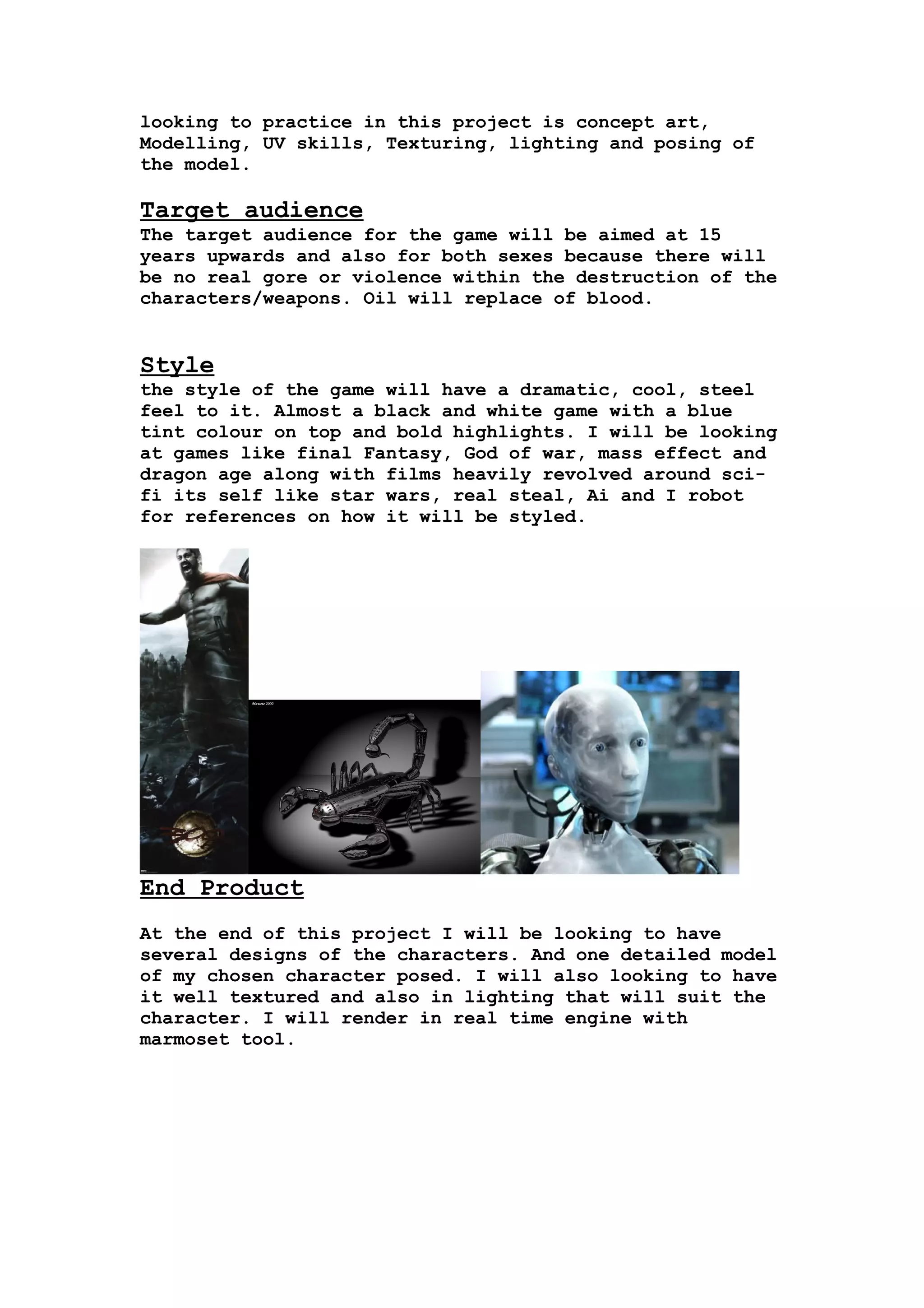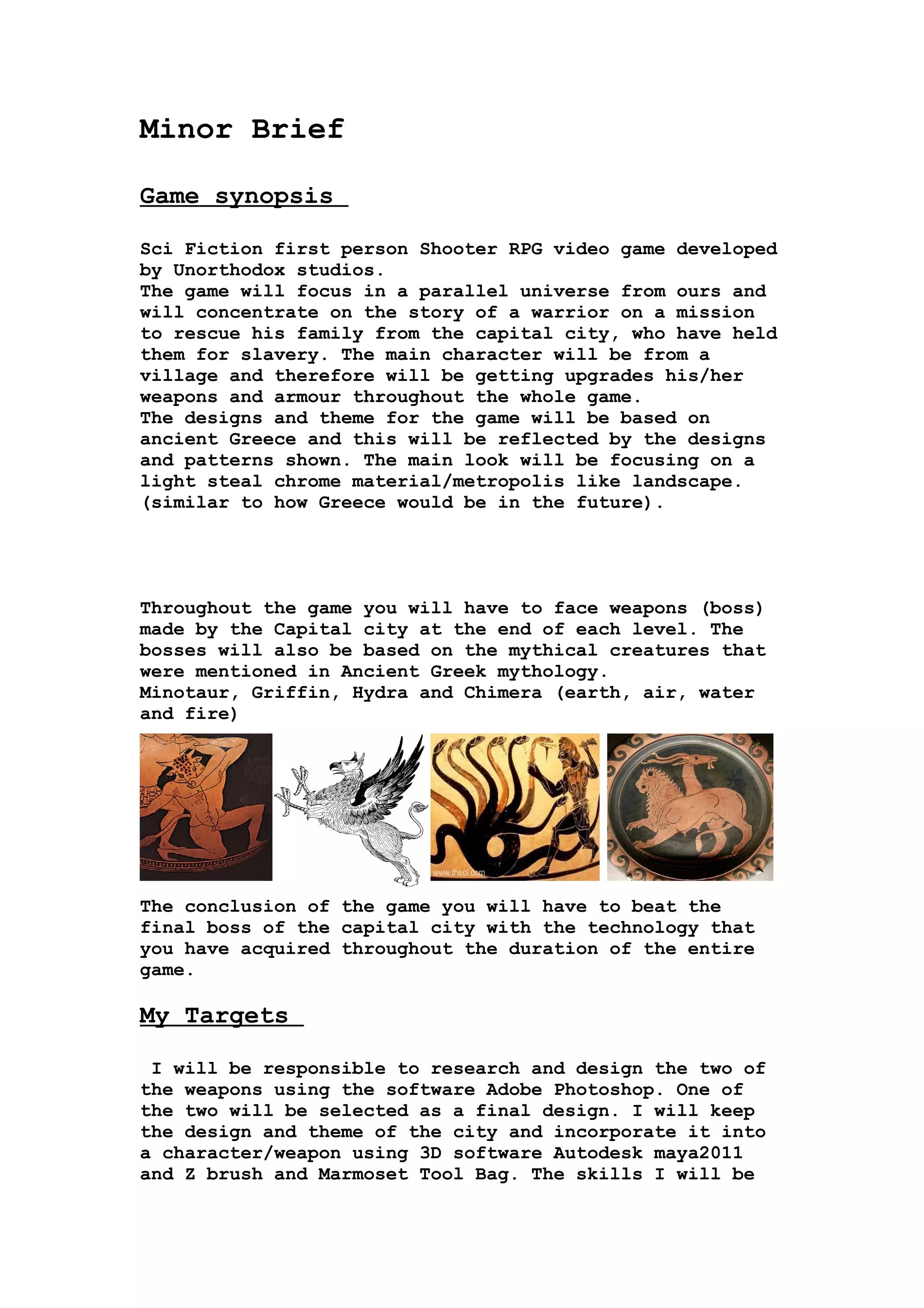 The document provides a game synopsis for a sci-fi first person shooter RPG video game set in a parallel ancient Greece-inspired world. The player controls a warrior on a quest to rescue their family from the capital city, gaining upgrades throughout their journey. Bosses are based on Greek mythology. The goal is to defeat the final boss in the capital city using technology acquired. The target audience is those aged 15 and up, with a dramatic steel and blue color style. The creator will design and model two weapons to be selected for the final game using 3D modeling software, practicing concept art, modeling, UV mapping, texturing, and lighting skills. The end product will be character designs and a detailed posed and textured 3