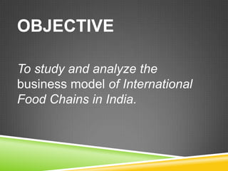 This document provides an analysis of the business models of international food chains operating in India. It begins with objectives and scope, defining key terms like international marketing and fast food. It then examines reasons for foreign chains entering the Indian market and common entry strategies like strategic alliances, joint ventures, and standalone entries. Case studies of McDonald's and Domino's entry into India via joint venture and franchising respectively are described in detail. Challenges faced by foreign food chains in India are also outlined. The document concludes with limitations coming from sole use of secondary data sources.