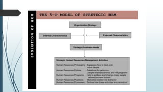 Strategic human resource management (SHRM) is the process of linking the human resource function with the strategic objectives of an organization to improve performance over the long term, typically more than one year. The aims of SHRM include developing strategic competencies, giving direction, achieving integration, and formulating business strategy. Benefits include identifying opportunities and threats, providing a clear vision and strategy, supplying competitive intelligence, recruiting and retaining talent, meeting customer expectations, ensuring high productivity, and ensuring business surplus.