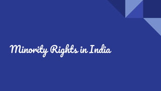 The document discusses minority rights in India, outlining the constitutional protections afforded to various ethnic, religious, and linguistic groups. It highlights the challenges faced by these minorities, including discrimination and violence, despite legal guarantees for their rights to preserve their identity and culture. Key legal provisions, particularly Articles 29 and 30, are examined to illustrate how these rights enable minorities to establish and manage educational institutions, while also acknowledging the state's regulatory powers to ensure educational standards.