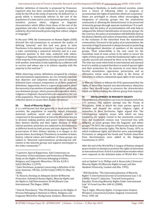This document discusses the development of minority rights from past centuries to the present. It begins by examining definitions of the term "minority" that have been proposed, noting there is no universally accepted definition. It then discusses the need for minority rights protections given that minorities are often politically marginalized and vulnerable to discrimination. The document traces how minority rights developed after World War I through the League of Nations, and then the United Nations adopted further protections like the 1992 Declaration on the Rights of Persons Belonging to National or Ethnic, Religious and Linguistic Minorities. Key international legal instruments that protect minority rights are also identified.