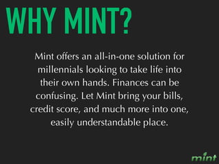 Mint offers an all-in-one financial solution aimed at millennials, helping them manage their bills and credit scores in a user-friendly format. The 'Mint Condition' campaign targets college-aged millennials through events at universities, featuring a scholarship contest and social media engagement using the hashtag #millennialsformint. Key statistics show that many millennials struggle with saving money due to debt and lack of financial knowledge.