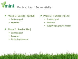 2) The "Seed" phase with under $1M in funding to build an alpha product and hire 5-6 employees focusing on product launch and revenue projections.