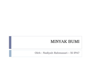 Minyak bumi merupakan sumber daya alam signifikan yang terdiri dari hidrokarbon dan dapat diolah menjadi berbagai produk seperti bensin, solar, dan LPG. Proses pembentukan minyak dan gas ini terjadi melalui teori biogenetik dan anorganik, di mana bahan organik terakumulasi dan berubah di bawah tekanan dan temperatur. Pengolahan minyak bumi melibatkan distilasi bertingkat dan berbagai proses lanjutan untuk menghasilkan fraksi yang digunakan sebagai bahan bakar dan produk industri.
