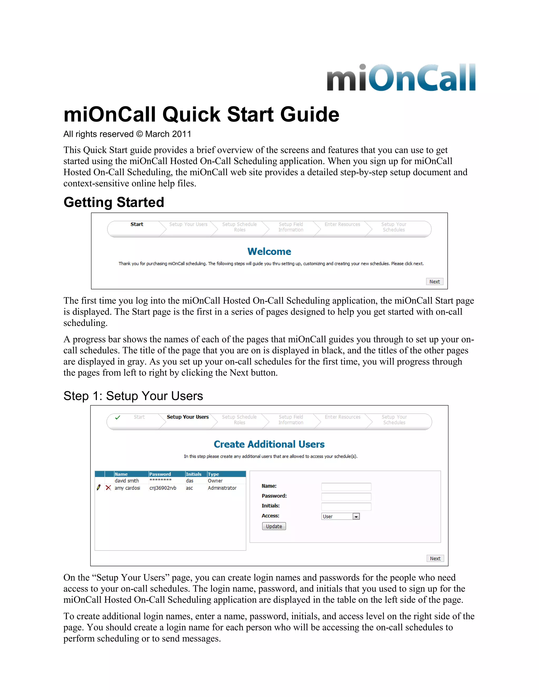 The Mioncall Quick Start Guide provides essential instructions for setting up the Mioncall hosted on-call scheduling application, outlining a step-by-step process for creating user accounts, defining roles, entering resources, and establishing schedules. It is designed to assist users with an intuitive interface and progress tracking as they configure their on-call schedules. Additionally, the document emphasizes confidentiality and includes trademarks and patent information related to the application.