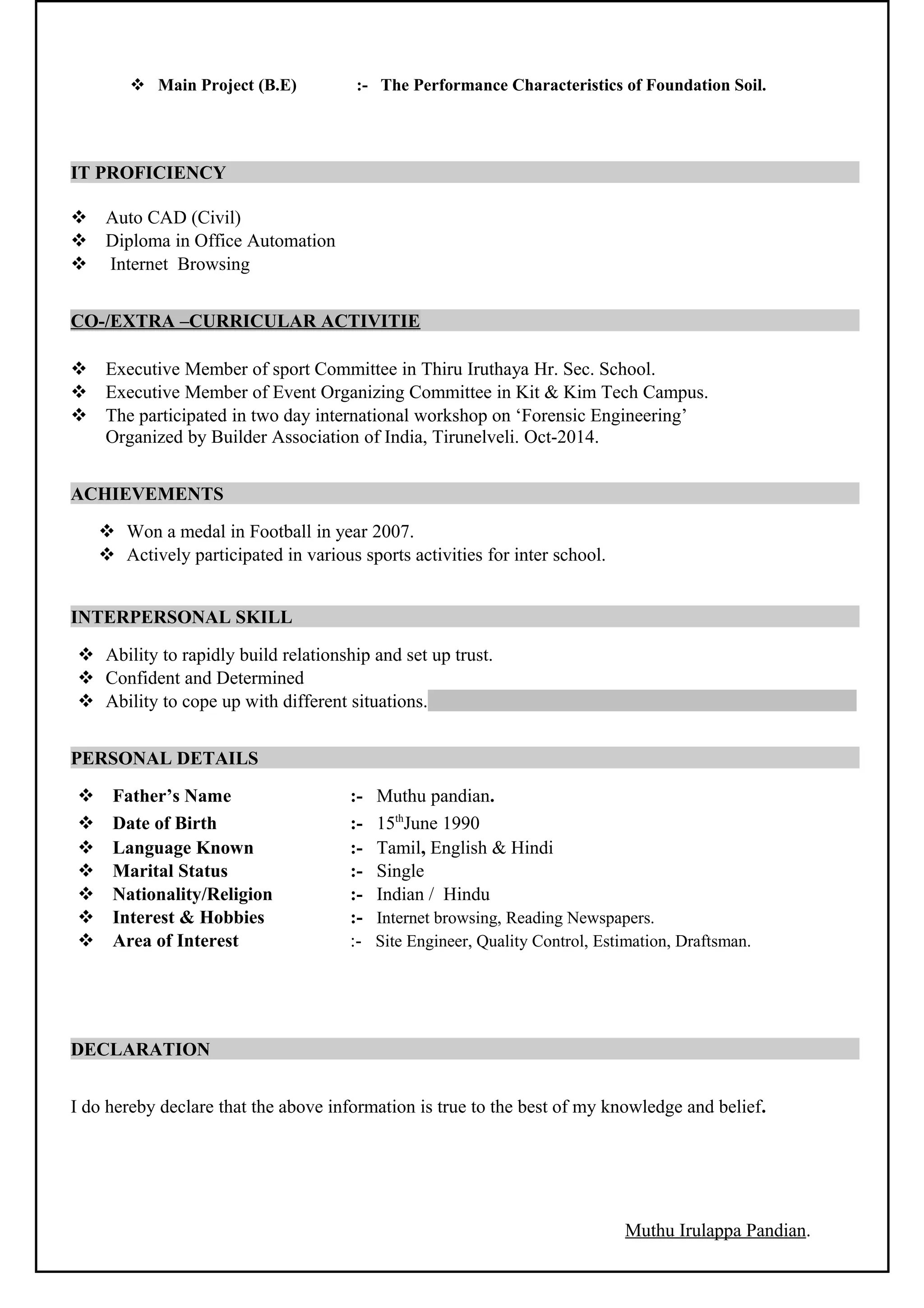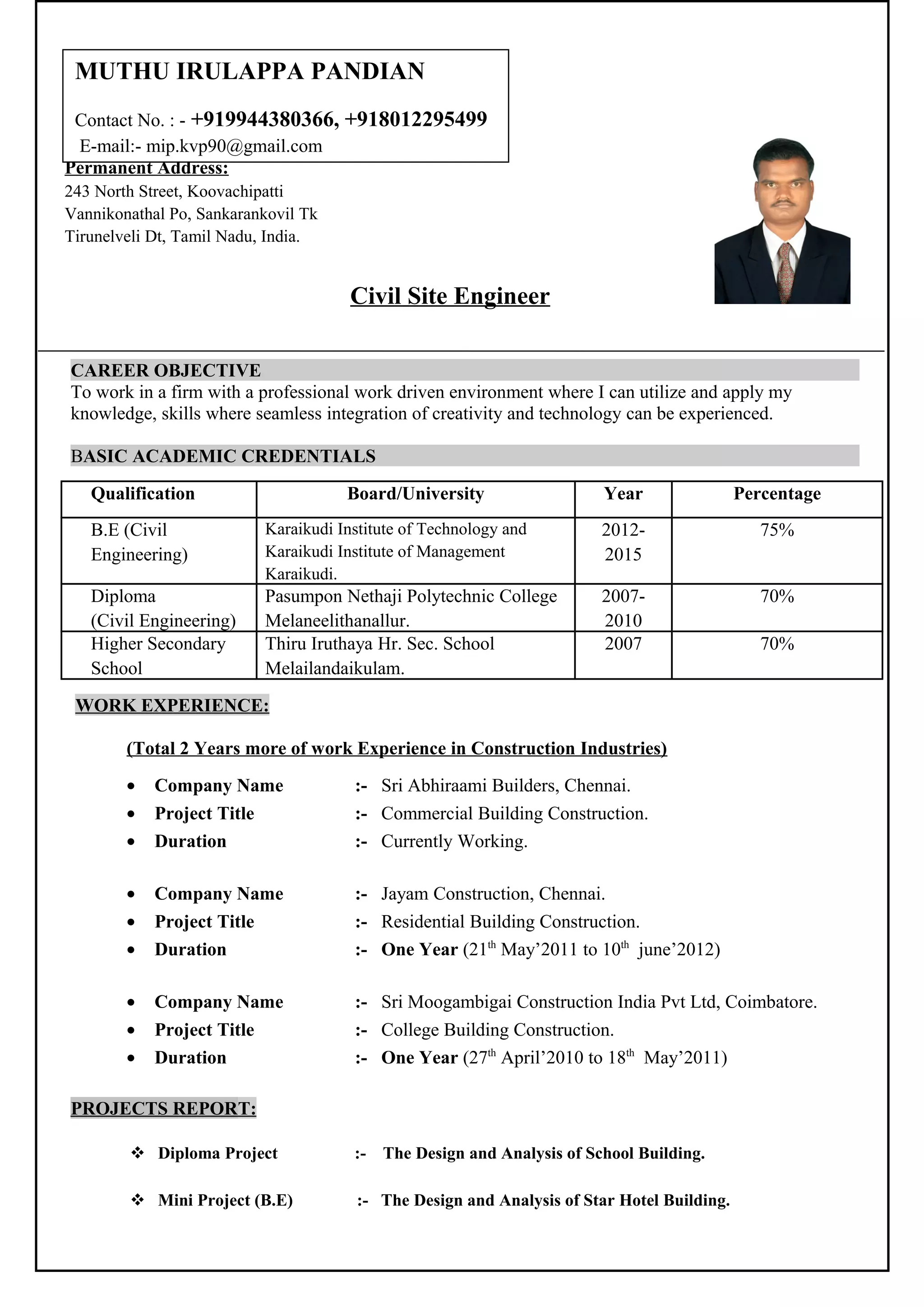 Muthu Irulappa Pandian is seeking a job as a civil site engineer. He has a Bachelor's degree in Civil Engineering from Karaikudi Institute of Technology and Management with 75% marks. He also has a diploma in Civil Engineering from Pasumpon Nethaji Polytechnic College with 70% marks. He has over 2 years of work experience in construction projects for various companies. His academic qualifications and work experience qualify him for roles as a site engineer, in quality control, estimation, and as a draftsman.