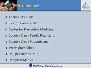 This document outlines details from a webinar on the Michigan Primary Care Transformation Demonstration Project that took place on October 23, 2013. It lists the practices in attendance and their scheduled dates to present their best practices. It also discusses funding, learning requirements, practice visits, the Choosing Wisely campaign, and the State Innovation Model initiative. The webinar covered key details about the project for the participating primary care practices.