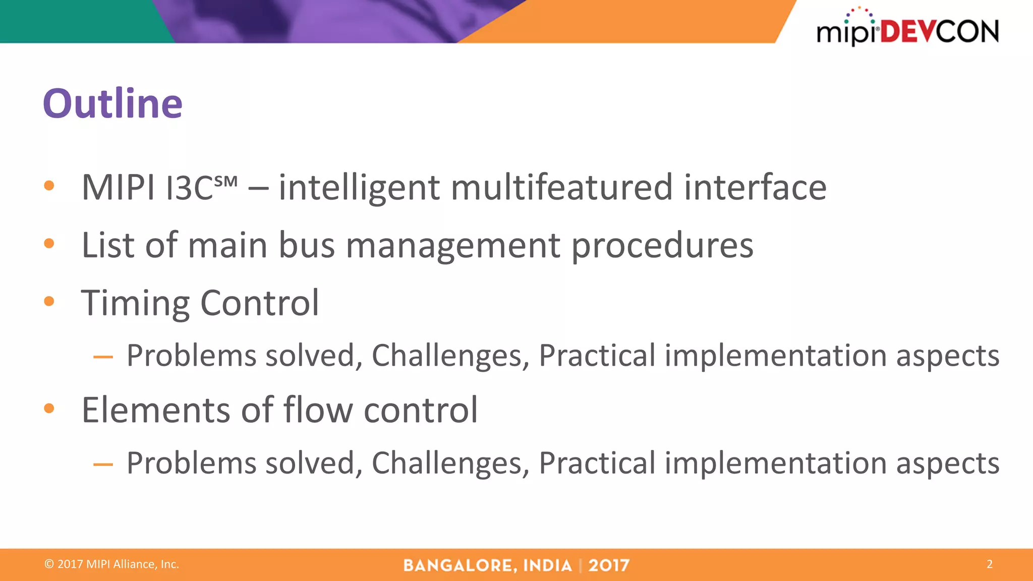 The document discusses the MIPI I3C interface, detailing its advanced features such as intelligent multi-featured communication, dynamic address assignment, and timing control for synchronous and asynchronous systems. It highlights the bus's capabilities to support multiple message types and flow control mechanisms while addressing problems and practical implementation challenges. Additionally, it examines the interaction of various components within the I3C framework, including command codes and transaction control methods.