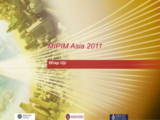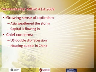 The document summarizes MIPIM Asia real estate conferences from 2009-2011. It finds that while 2009 had cautious optimism due to Asia weathering the financial crisis, 2010 saw strong optimism with China leading growth. In 2011, China is seen as driving Asian real estate, but there are mixed short-term views due to global economic concerns and government policy risks. Overall, Asian real estate markets are still seen as opportunities, though investors are becoming more discerning in targeting markets and assets.
