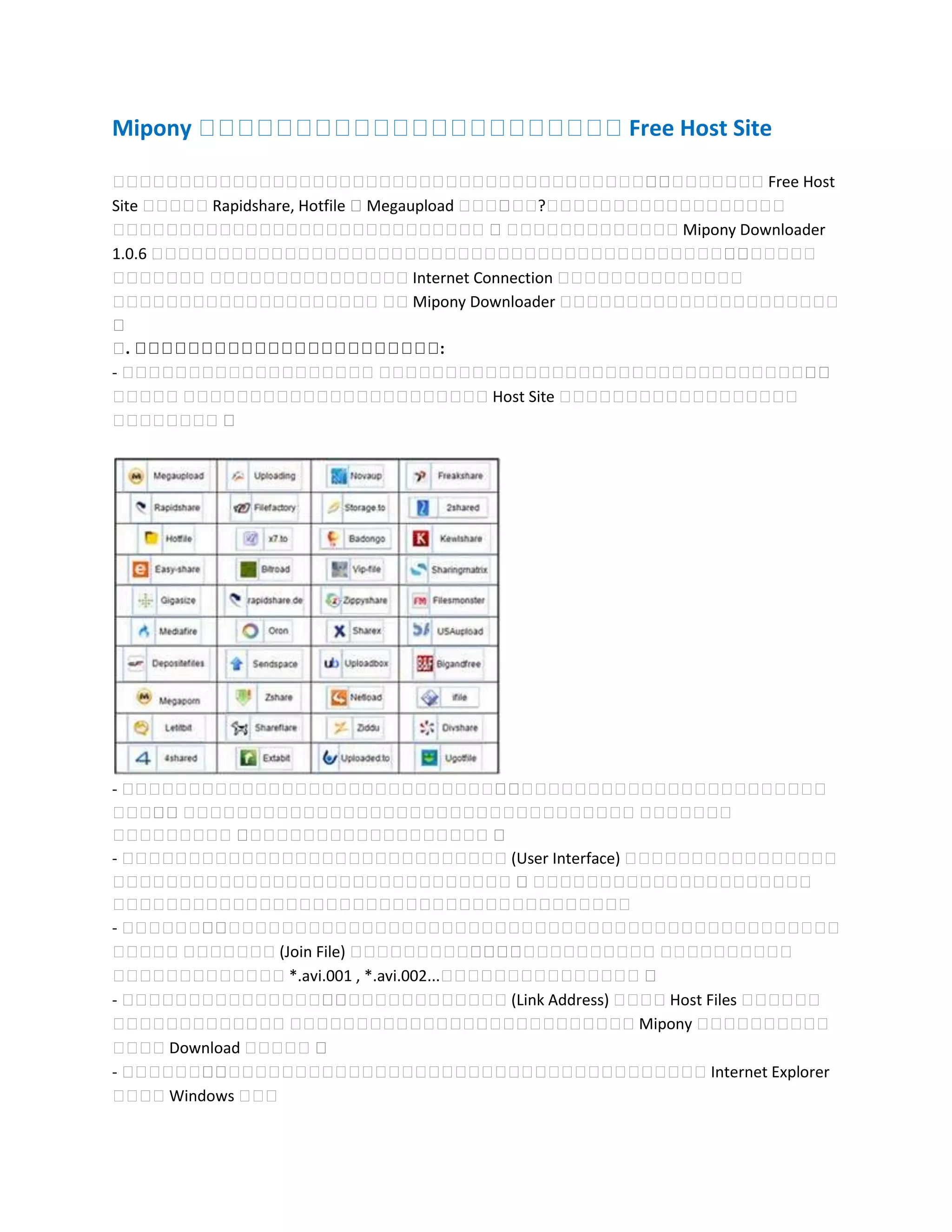 Mipony អ្នកជំនួយការទាញឯកសារពី FreeHost Siteតើអ្នកកំពុងជួបប្រទះបញ្ហាលំបាកក្នុងការទាញយកឯកសារពី Free Host Site ដូចជា Rapidshare, Hotfile ឬ Megaupload ដែរឬទេ?លោកអ្នកពិតជាអាចមានដំណោះស្រាយចំពោះបញ្ហាខាងលើនេះ ។ ជាមួយកម្មវិធី Mipony Downloader 1.0.6 ដែលជាជម្រើសដ៏ល្អបំផុតសម្រាប់អ្នកក្នុងការទាញយកឯកសារដែលអ្នក ចង់បានបើទោះបីជា Internet Connection របស់អ្នកមានការរអាក់រអួលយ៉ាងណាក៏ដោយ ក៏ Mipony Downloader នូវតែអាចជួយអ្នកបានដែរ ។១. លក្ខណៈពិសេសរបស់កម្មវិធី:- ជាកម្មវិធីឥតគិតថ្លៃ សម្រាប់ជំនួយជួយបង្កើនល្បឿនការទាញយកឯកសារ ដែលជាពពួកឯកសារផ្ទុកនៅលើ Host Site ដែលមានបង្ហាញដូចរូបខាងក្រោម ៖- មានលទ្ធភាពពិសេសអាចធ្វើការទាញយកបន្តនូវទិន្នន័យដែលកំពុងទាញយក មានបញ្ហាដោយសារការដាច់ចរន្តអគ្គិសនី ការដាច់អ៊ីនធឺណិត ឬដោយបុព្វហេតុផ្សេងៗ ។- មានចំណុចប្រទាក់អ្នកប្រើសាមញ្ញ (User Interface) ជាមួយរូបតំណាងដែលចាំបាច់ក្នុងការប្រើប្រាស់ចំនួន ៦ ដែលជាកត្តាផ្ដល់នូវភាពងាយស្រួលក្នុងការប្រើប្រាស់និងគ្រប់គ្រង។- ភ្ជាប់មកជាមួយរូបតំណាងកម្មវិធីដែលមានមុខងារសម្រាប់បញ្ចូលឯកសារ ចូលគ្នា (Join File) ដែលបានទាញយកមកដាច់ពីគ្នា ដូចជាឯកសារភាពយន្តប្រភេទ *.avi.001 , *.avi.002...បានយ៉ាងងាយស្រួល ។- មានសមត្ថភាពចាប់យកអាសយដ្ឋានតំណ (Link Address) របស់ Host Files បានដោយស្វ័យប្រវត្តិ និងមិនរំខានដល់ដំណើរការរបស់ Mipony នៅពេលកំពុងជាប់ Download នោះទេ ។- ភ្ជាប់មកជាមួយនូវកម្មវិធីដែលមានមុខងារដូចទៅនឹង Internet Explorer របស់ Windows ដែរ២.ការដំឡើងកម្មវិធី:សូមចុចលើ File Setup (មាននៅក្នុង CD របស់ទស្សនាវដ្ដី CM) រួចធ្វើតាមការណែនាំដែលមានស្រាប់នៅលើអេក្រង់កម្មវិធី ។ ដើម្បីដំឡើងកម្មវិធីនេះបានវាតម្រូវឲ្យអ្នកដំឡើង .NET Framework ដូច្នេះប្រសិនបើអ្នកមិនទាន់បានដំឡើងកម្មវិធី .NET Framework ទេសូមធ្វើការដំឡើងវាជាមុនសិន (កម្មវិធីនេះអាចរកបាននៅក្នុង CD របស់ទស្សនាវដ្ដី CM)។ ក្រោយពីដំឡើងបានជោគជ័យវានឹងបង្ហាញនូវផ្ទាំងកម្មវិធីដូចខាង ក្រោម ៖ ៣. ស្វែងយល់ពីមុខងារ រូបតំណាងក្នុងកម្មវិធី:Mipony មានការប្រើប្រាស់នូវរូបតំណាងដែលសកម្មចំនួន ៤ ប៉ុណ្ណោះសម្រាប់ធ្វើការកំណត់ និងបញ្ជានូវកម្មវិធីឲ្យដំណើរការដោយរលូន ។ សូមស្វែងយល់ពីរូបតំណាងទាំងនេះដូចខាងក្រោម ៖- ជារូបតំណាងសម្រាប់បញ្ជាបើកកម្មវិធីរុករកអ៊ីនធឺណិត បានយ៉ាងរហ័សវាមានតួនាទីដូច Internet Explorer ឬ FireFox ដូច្នេះដែរ ។- មានតួនាទីសម្រាប់បន្ថែមអាសយដ្ឋានតំណ សម្រាប់ទាញយក (Download) ។ - មានតួនាទីសម្រាប់ផ្គុំឯកសារឡើងវិញ (សម្រាប់ឯកសារដែលអ្នកបានទាញយកច្រើនផ្នែក ភាគច្រើនជាឯកសារភាពយន្ត)។ - ប្រើសម្រាប់កំណត់លក្ខណៈផ្សេងៗក្នុងកម្មវិធី ។ ៤. ស្វែងយល់ការប្រើប្រាស់កម្មវិធី:៤.១ របៀបទាញយកឯកសារក្នុងតំណ- លោកអ្នកអាចប្រើ Browser របស់ Mipony ដោយចុចលើរូបតំណាង Browse and download រួចបើកអាសយដ្ឋានវ៉ិបសាយណាមួយដែលអ្