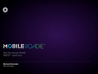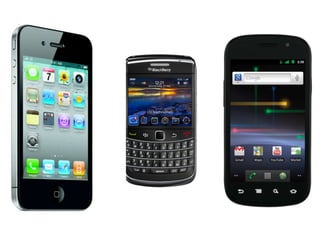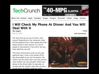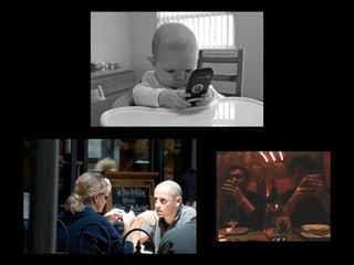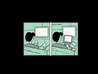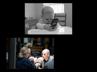 The document discusses the rise of the two screen world, with people using both their mobile phones and other screens like tablets or computers. It notes that 95% of people will check their phones during a presentation, and that there are now over 5 billion mobile phone users. The mobile industry is growing rapidly, with Android and iOS being the dominant mobile operating systems and people spending significant time and money on mobile apps. The definition of "mobile" is changing as more people access the internet from their phones than computers.