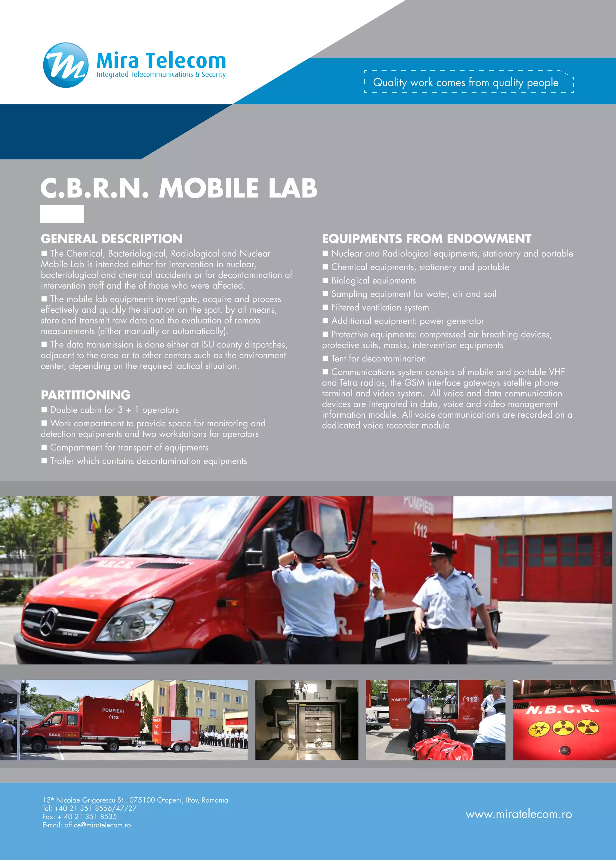 The document describes the capabilities and equipment of a mobile lab and command center for emergency situations, focusing on chemical, biological, radiological, and nuclear incidents. It highlights the lab's ability to conduct real-time investigations, data transmission, and decontamination, while the command center enhances emergency response through communication interoperability and monitoring systems. Additionally, it notes the integration of various software and hardware for effective disaster management and response coordination.