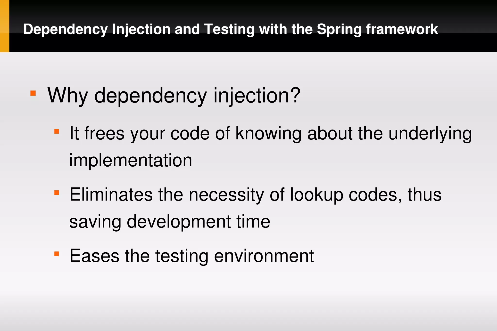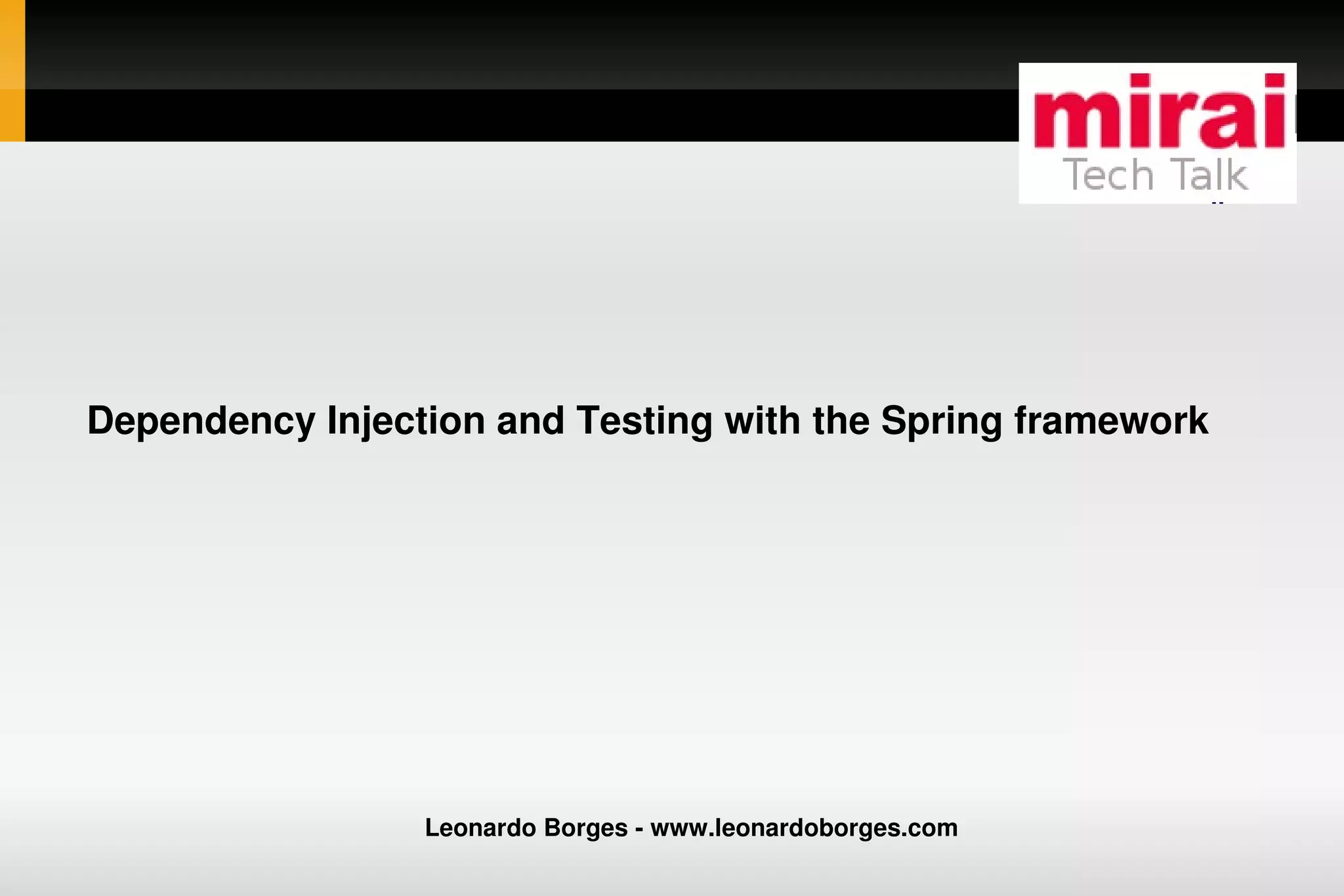 Dependency injection with Spring allows code to be decoupled from implementations by injecting dependencies. This makes code easier to test by allowing real objects to be substituted with mocks. The document demonstrates using Spring to inject different DAO implementations into a service class, and shows how this improves testability by allowing tests to inject mock DAOs. The conclusion is that Spring dependency injection enables independence and high testability through easy substitution of real objects with mocks.