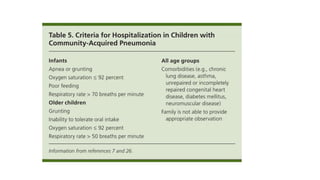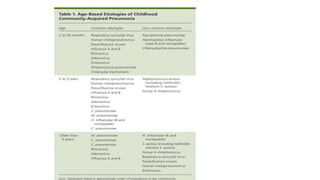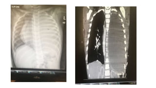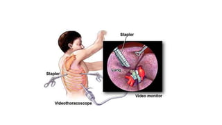 Miral is a 2.5 year old girl who has had intermittent fever and respiratory symptoms for 1 month. She has lost 1.2 kg and has decreased activity levels. Examinations suggest she has a pleural effusion that was drained, revealing 1000ml of pus. She underwent VATS surgery and is being treated with vancomycin, albumin, dexamethasone, and intubation. VATS procedures can be used to drain effusions, perform biopsies, and remove parts of the lung or tumors. Preschool aged children with pneumonia are usually treated with amoxicillin, while older children receive macrolides.