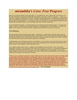 The core of mirambika's education philosophy is to keep the psychic flame, or divine presence within each person, burning strongly. This psychic presence is seen as the core of our psychological being. The goal of their education is to allow one's entire life to be molded by a growing psychic consciousness, and to create a more beautiful, true and loving environment from within.