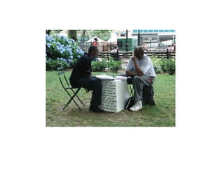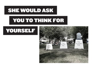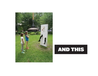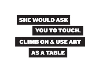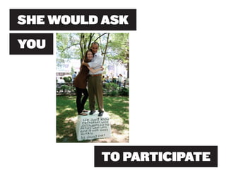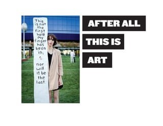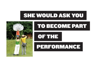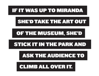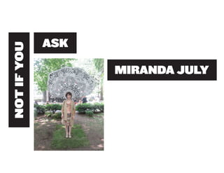 Miranda July is a multidisciplinary artist born in 1974 who works in performing, writing, filmmaking, and other mediums. She began her creative career as a teenager writing and directing plays in Berkeley, California. July believes art should engage audiences and invites them to participate in and help create her works. Her 2010 outdoor sculpture installation "11 Heavy Things" in New York's Union Square Park transformed as participants interacted with the works and shared photos online, completing the art through collaboration.