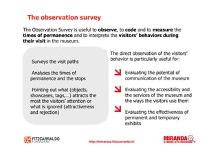 The Observation Survey tool collects real-time data on mobile devices and displays it on a web application for analysis. It aims to evaluate displays and communication, optimize data collection, and train museum staff. Several Italian museums have experimented with the Miranda Observation Survey tool.