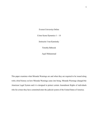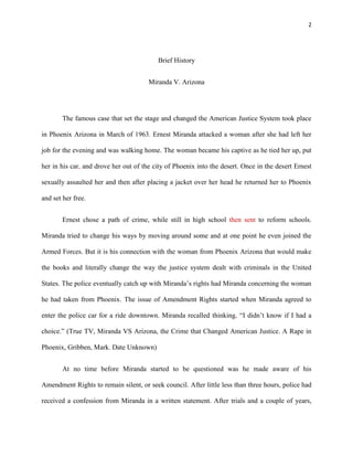This document discusses the Miranda rights and their origin from the 1966 Supreme Court case Miranda v. Arizona. It provides details of the case, in which Ernest Miranda was questioned by police without being informed of his right to remain silent or have an attorney present. His confession was later ruled inadmissible. As a result, the Supreme Court ruled that suspects in custody must be read their Miranda rights, including the right to remain silent and have an attorney, before being questioned. The document outlines the typical Miranda warnings and explains that they are meant to protect 4th and 5th amendment rights and must be given before formal questioning begins if a suspect is in custody.
