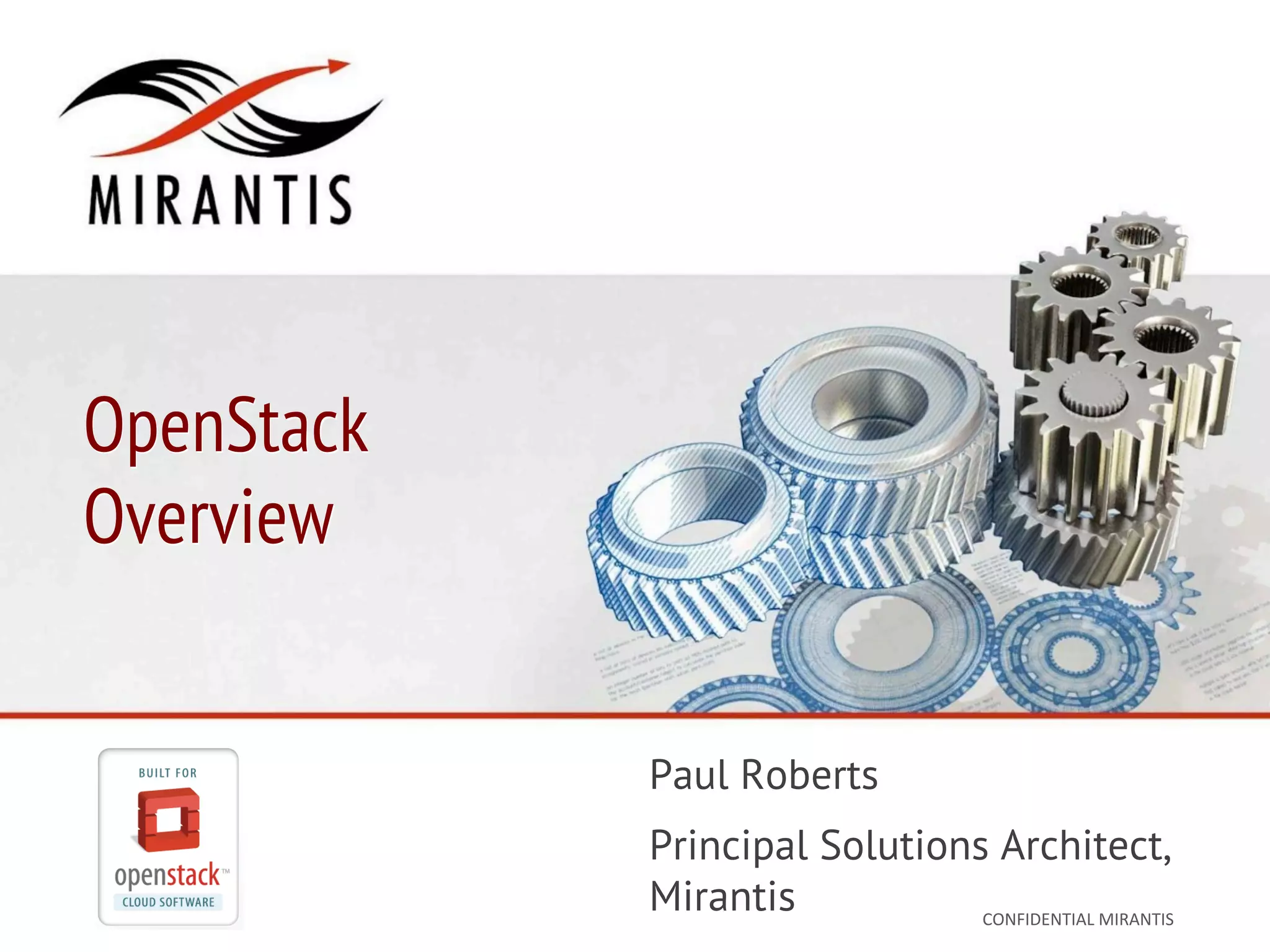 This document presents an overview of OpenStack, detailing its purpose, history, and architecture as a cloud computing initiative. It emphasizes its evolution since its inception, the various components and services, as well as the architecture that enables infrastructure as a service (IaaS). Additionally, it discusses trends in cloud computing, the importance of OpenStack in building automated clouds, and the provisioning process for virtual machines.