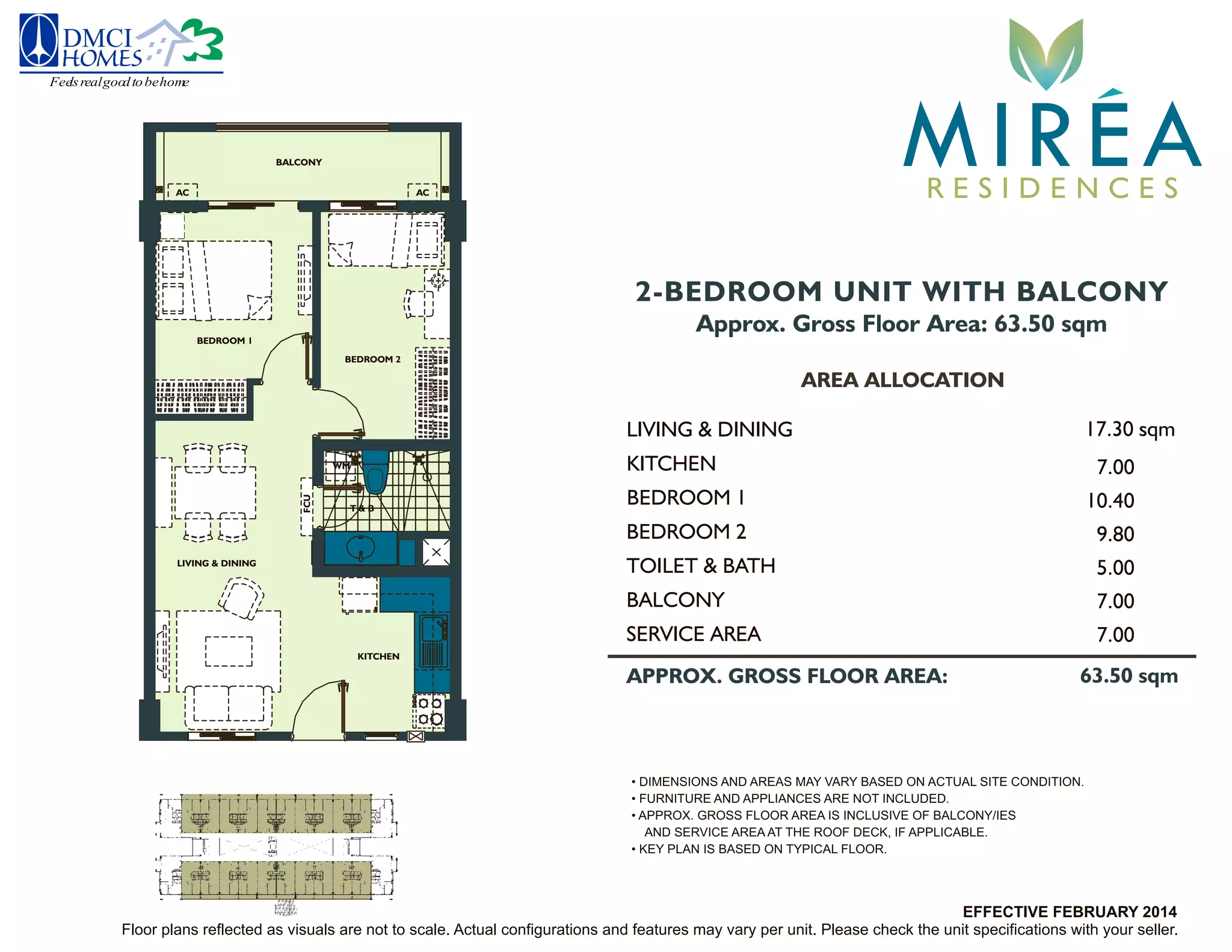 The document provides details about various apartment floor plans and their respective configurations, including 2-bedroom, 3-bedroom, and tandem units, highlighting their gross floor areas and area allocations. It specifies that floor plans are not to scale, dimensions may vary based on actual site conditions, and that furniture and appliances are not included. Additionally, it emphasizes the importance of checking the unit specifications with the seller and notes that the information is effective from February 2014.