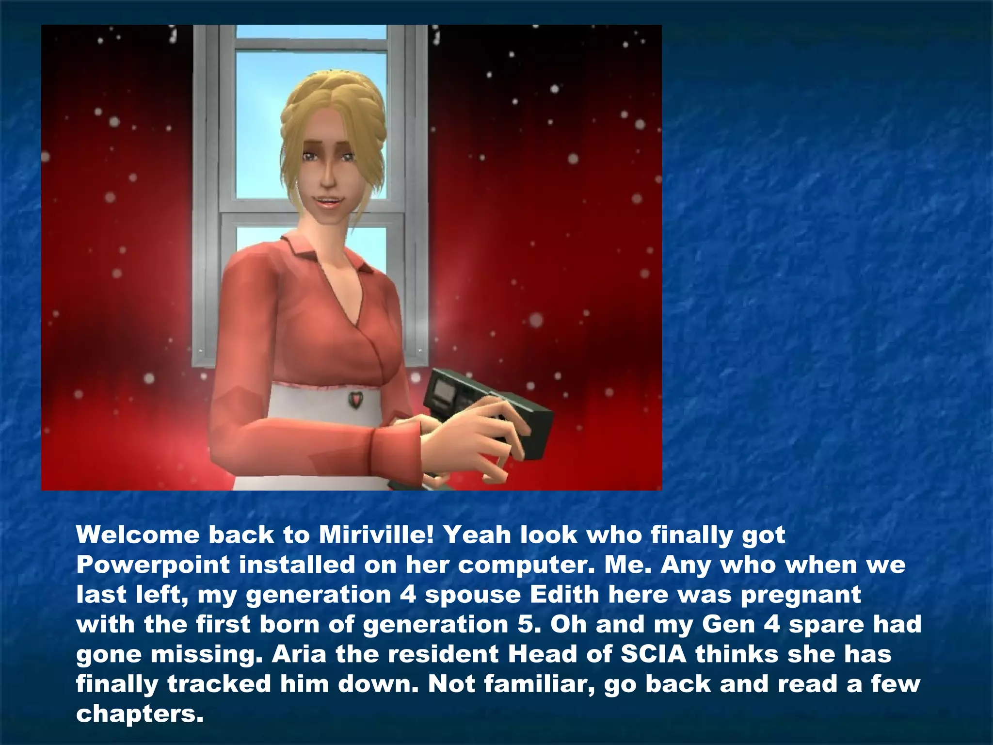 The document summarizes recent events in the Sims family. Edith, the Generation 4 spouse, had twins, named Solitaire and Pong, adding to her existing children Risk and the new baby. Sprite continues to bond with her great-grandchildren. Johann's brother Amadeus runs his successful electronics store with help from Sprite. Amadeus' mother continues harassing him despite his objections.