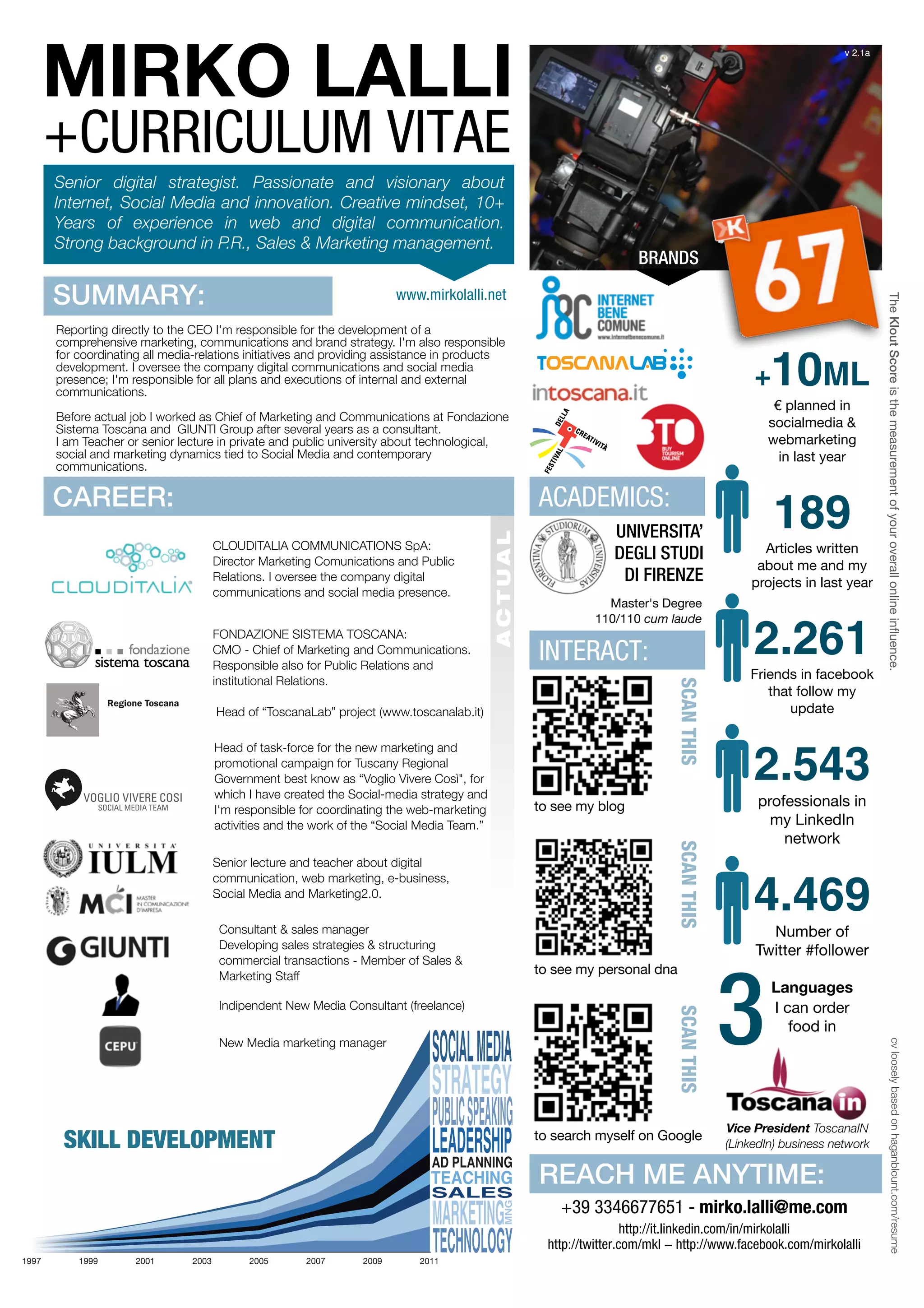 This document is a curriculum vitae for Mirko Lalli, summarizing his experience and qualifications. He has over 10 years of experience in web and digital communications, and currently serves as the Director of Marketing Communications and Public Relations for CloudItalia Communications, where he oversees digital communications and social media presence. Prior to this role, he held marketing and communications roles at Fondazione Sistema Toscana and has consulted for other organizations.