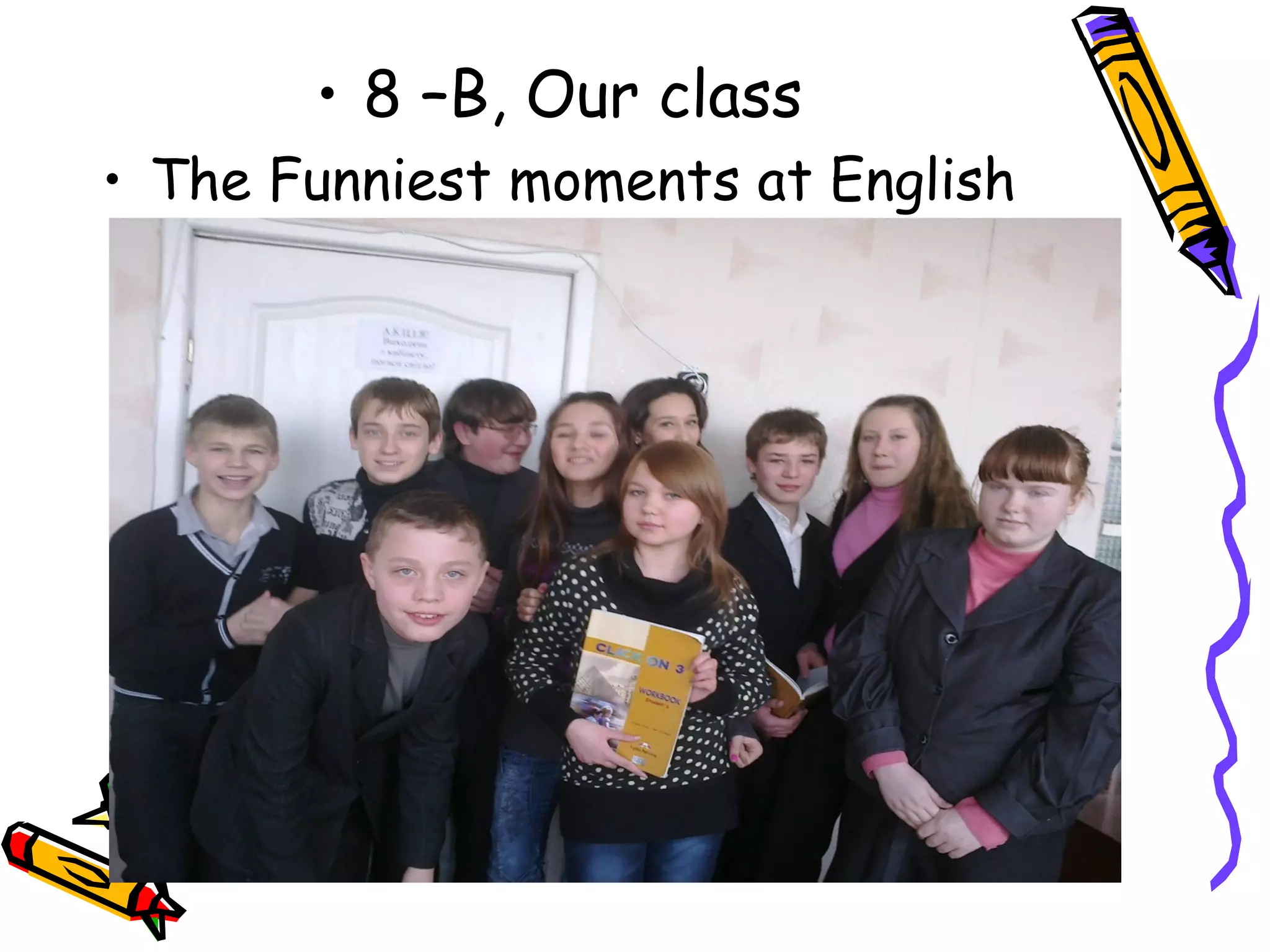 The document describes several funny moments that occurred in the narrator's 8th grade English class. It mentions that the class likes to joke around, especially with the boys, during English lessons to make them more interesting. It provides some examples, such as a classmate breaking his pencil to sharpen it further, another student not wanting to return a coin the teacher was showing, and boys wearing Christmas tree toys as earrings. The class is described as being the most unusual in the school.