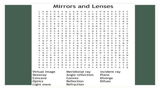 The document explains the concept of mirrors and reflection, detailing the characteristics of plane and curved mirrors. It describes how to conduct an activity to observe image properties in a plane mirror, including aspects of size, orientation, and types of images (real vs. virtual). Additionally, it covers the concepts of incident and reflected rays, as well as the normal line associated with reflection.