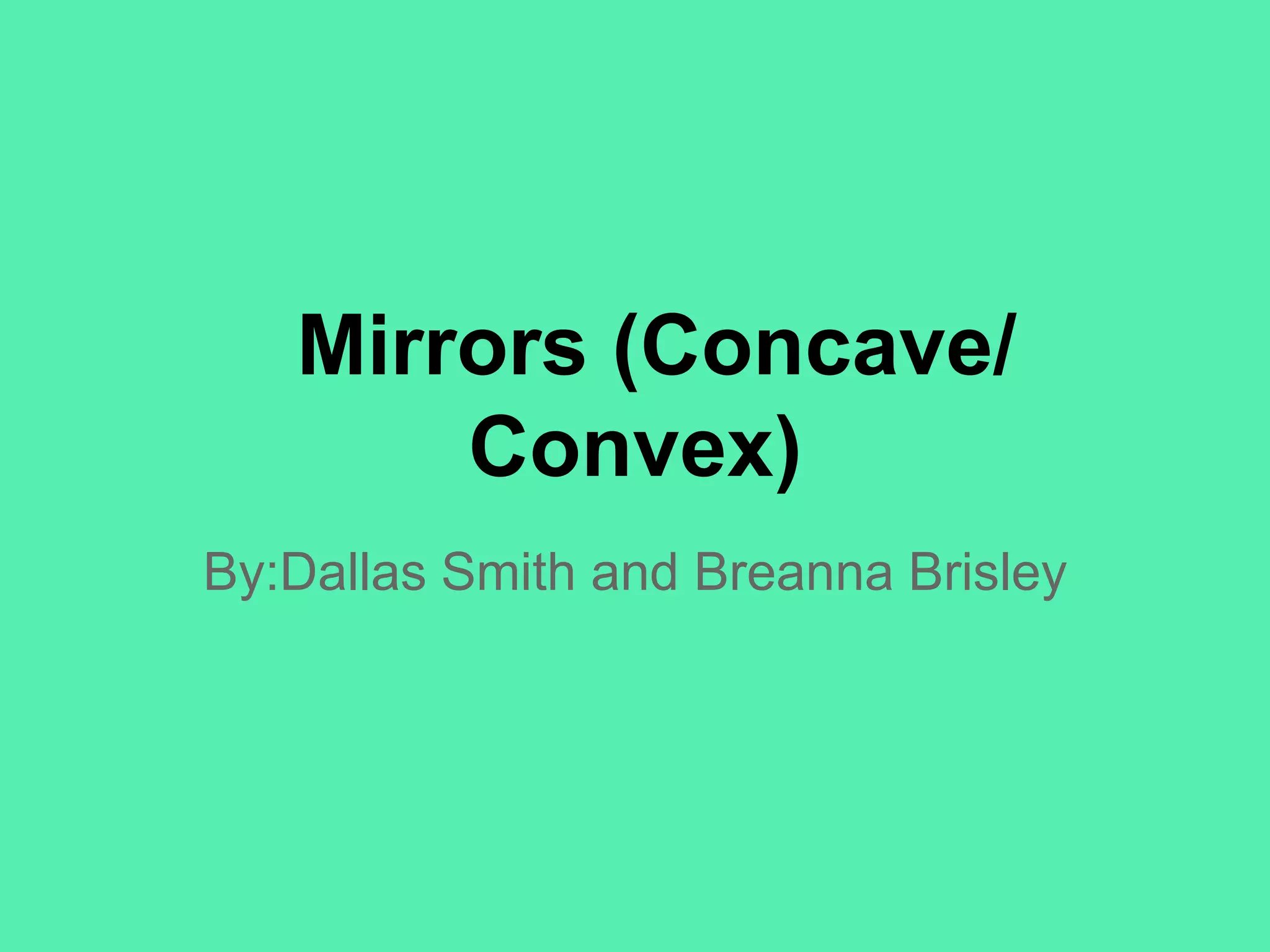 This document discusses different types of mirrors and their properties. It distinguishes between concave and convex mirrors. Concave mirrors curve inward and focus light, producing real or virtual images depending on the object's distance. Convex mirrors curve outward and always produce smaller, upright, virtual images. Examples of uses for each type of mirror are given, including car headlights, security mirrors, and makeup mirrors. Real images are described as inverted while virtual images are upright. A diagram is also included to illustrate ray diagrams and image formation using mirrors.