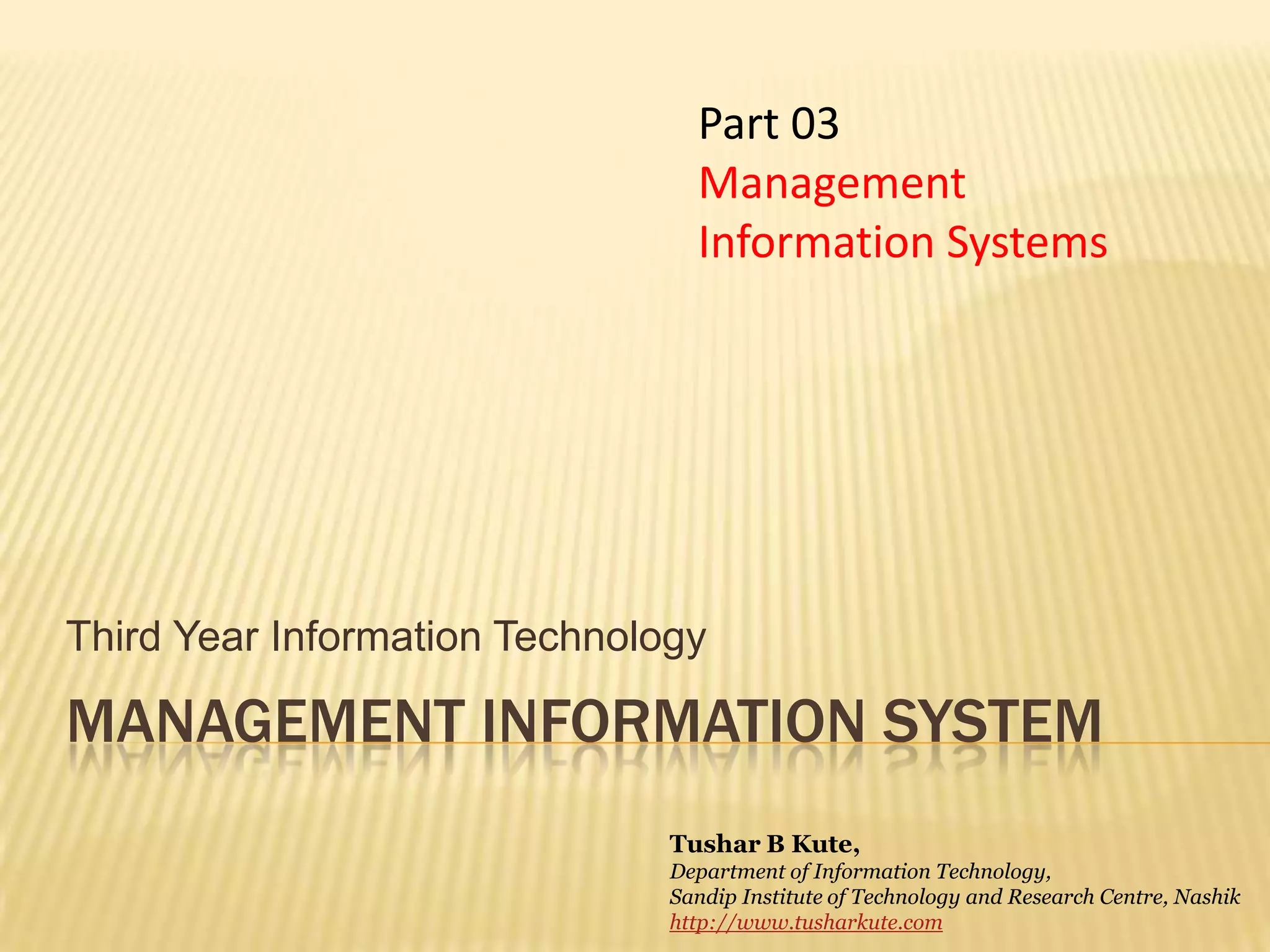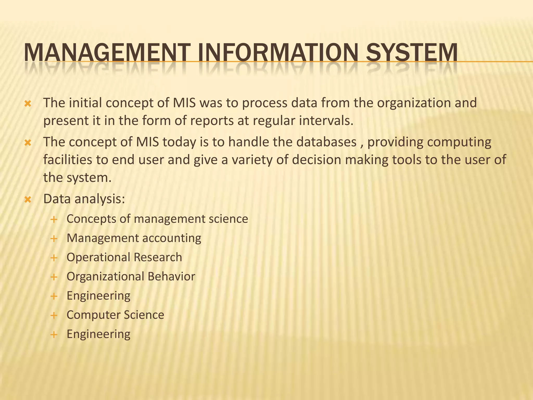 The document discusses management information systems (MIS). It defines MIS as a system that provides information to support decision making and operations in an organization. MIS relies on collecting, processing, storing, and analyzing data from all parts of an organization and presenting it in a useful way to managers, executives, and other users. An effective MIS supports all business functions and management processes, including planning, organizing, staffing, directing, coordinating, and controlling. It provides timely, accurate information to help managers monitor performance, identify issues, and make informed decisions.