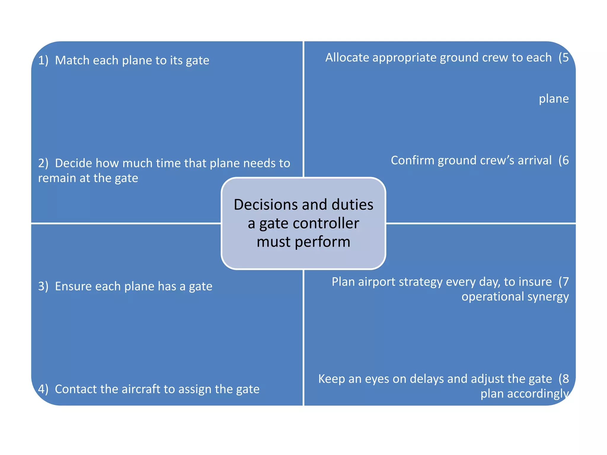 Gate controllers at airports ensure that incoming aircraft have assigned gates, requiring real-time awareness of plane and ground crew locations. Information systems play a critical role in providing updated data on arrivals, departures, and gate statuses, enabling efficient decision-making. The use of such systems is essential for both current operations and long-term planning in airport management.
