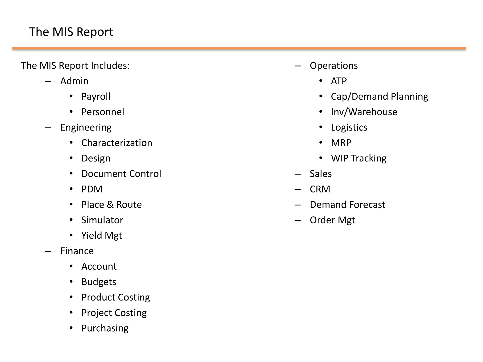 The MIS report includes various operational, administrative, engineering, finance, sales, and CRM reports. Some example reports discussed are the bill of materials, goods receive note, sales by product and dealer, payroll, pending purchase orders, trial balance, and delivery challan. The document also provides examples of daily sales detail, key indicator, demand by sales rep, and exception reports. Finally, it discusses drill down reports in MIS that provide detailed data to analyze situations like quarterly earnings performance versus forecasts.