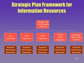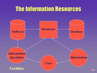 The document provides an overview of management information systems and information technology in business. It discusses the history of IT and how it has evolved from manual transactions to modern business software, computer communications, data warehousing, and business intelligence tools. It also describes how physical and virtual (information) resources are used by businesses to address problems and pressures. Information systems are presented as virtual systems that represent and control physical systems in organizations.