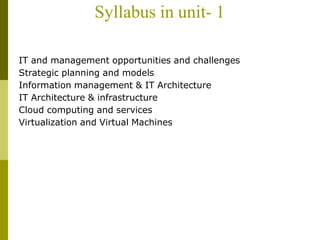 1. The syllabus for a MIS unit which includes IT opportunities and challenges, strategic planning models, information management, IT architecture and infrastructure, cloud computing, and virtualization.