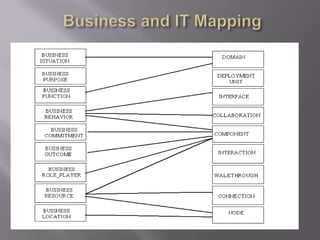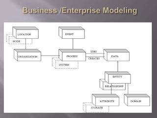 The document discusses business modeling and how modeling systems can help businesses redesign processes to cut costs. It states that a business model must be adaptable to changing customer needs and priorities. The modeling system allows businesses to link IT systems to organizational information and processes in a relational way to facilitate redesigning processes.