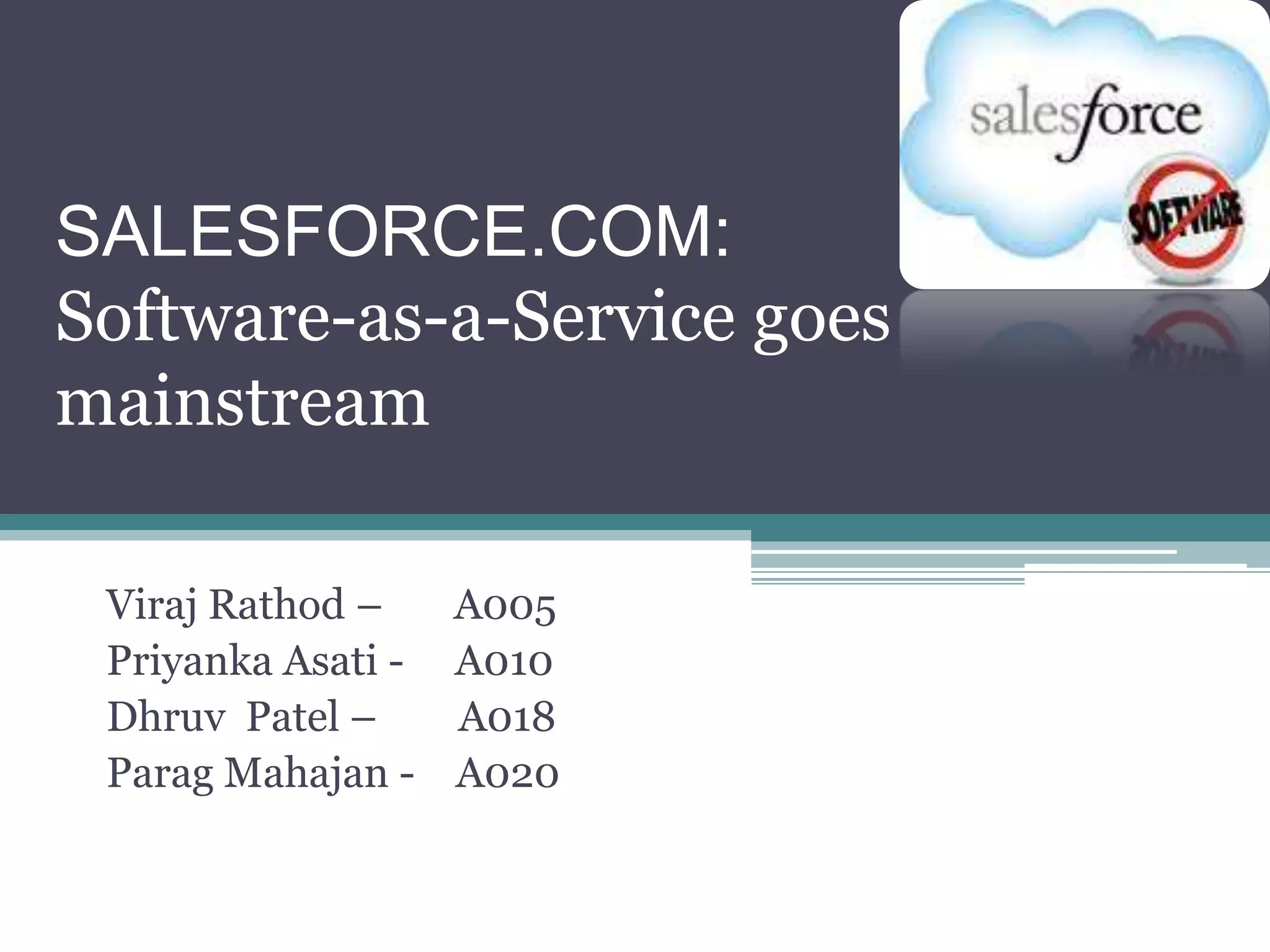 The document discusses Salesforce.com, the leading provider of customer relationship management (CRM) software delivered as a service. It provides information on Salesforce's history and success, how it overcome key challenges of competitors and expansion, and how features like the App Exchange allow third-party developers to create add-ons for its platform. The document also outlines some of the advantages and disadvantages of Salesforce's software-as-a-service model compared to traditional on-premise CRM software.