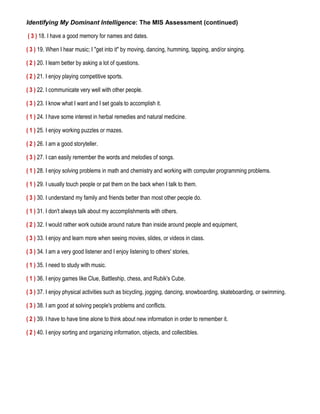 This document contains an assessment called the MIS Assessment that is used to identify a person's dominant intelligences. It contains 40 statements that are rated on a scale of 1 to 3. The scores for each statement are then tallied according to 8 categories of intelligence. The person identified their top 3 scores as Interpersonal with 15, Verbal/Linguistic and Musical/Rhythm both with 13, and Intrapersonal with 12. This tally is meant to help identify strengths but not measure worth or future success.