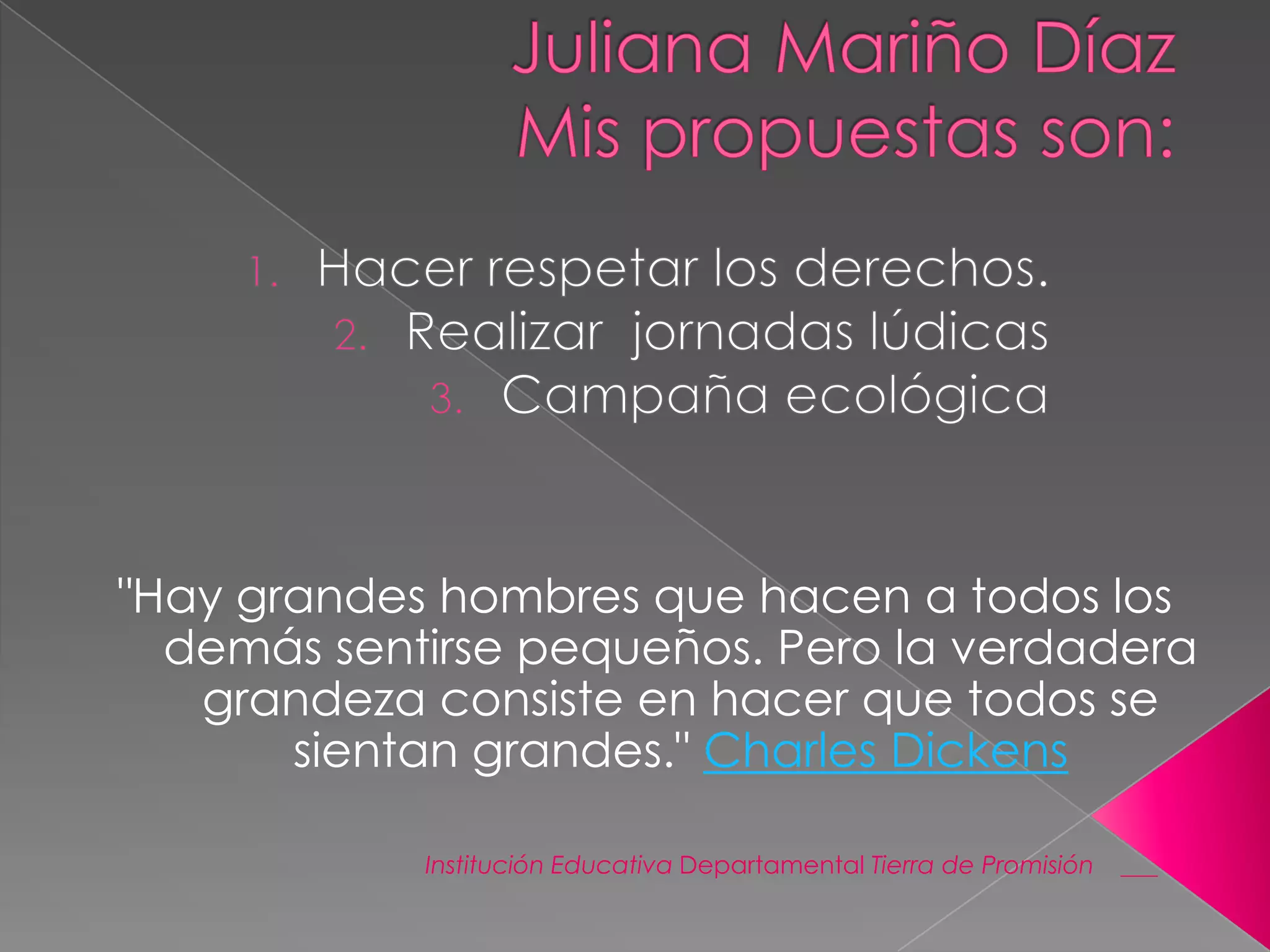 La candidata a la personería, Juliana Mariño Díaz, propone hacer respetar los derechos de los estudiantes, realizar jornadas lúdicas semestrales con diferentes actividades, y llevar a cabo una campaña ecológica de reciclaje y aseo del colegio. También menciona otras iniciativas como mejorar la enfermería, participar en el reinado del festival del Bambuco, gestionar un comedor adecuado y realizar actividades recreativas periódicas. Su objetivo es escuchar a los estudiant