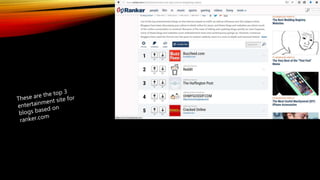 This document provides an overview of Web 2.0 technologies and programs, including blogs, cloud storage services, and social networking sites. It discusses top tech blogs like Mashable, Gizmodo, and GigaOM and describes their formats and purposes. Popular cloud storage options like Google Drive and Dropbox are explained for storing and sharing files online. LinkedIn is recommended as a professional networking tool. Various blogs and social media sites are evaluated for their designs, audiences, and perspectives.