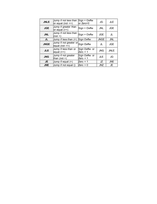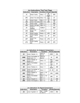 This document describes the Jcc family of conditional jump instructions in x86 assembly language. It provides the instruction name, description of the condition tested, and any alternative mnemonics or opposite instructions. The instructions test various CPU flags like carry, zero, sign, overflow, parity, and compare values based on signed or unsigned arithmetic.