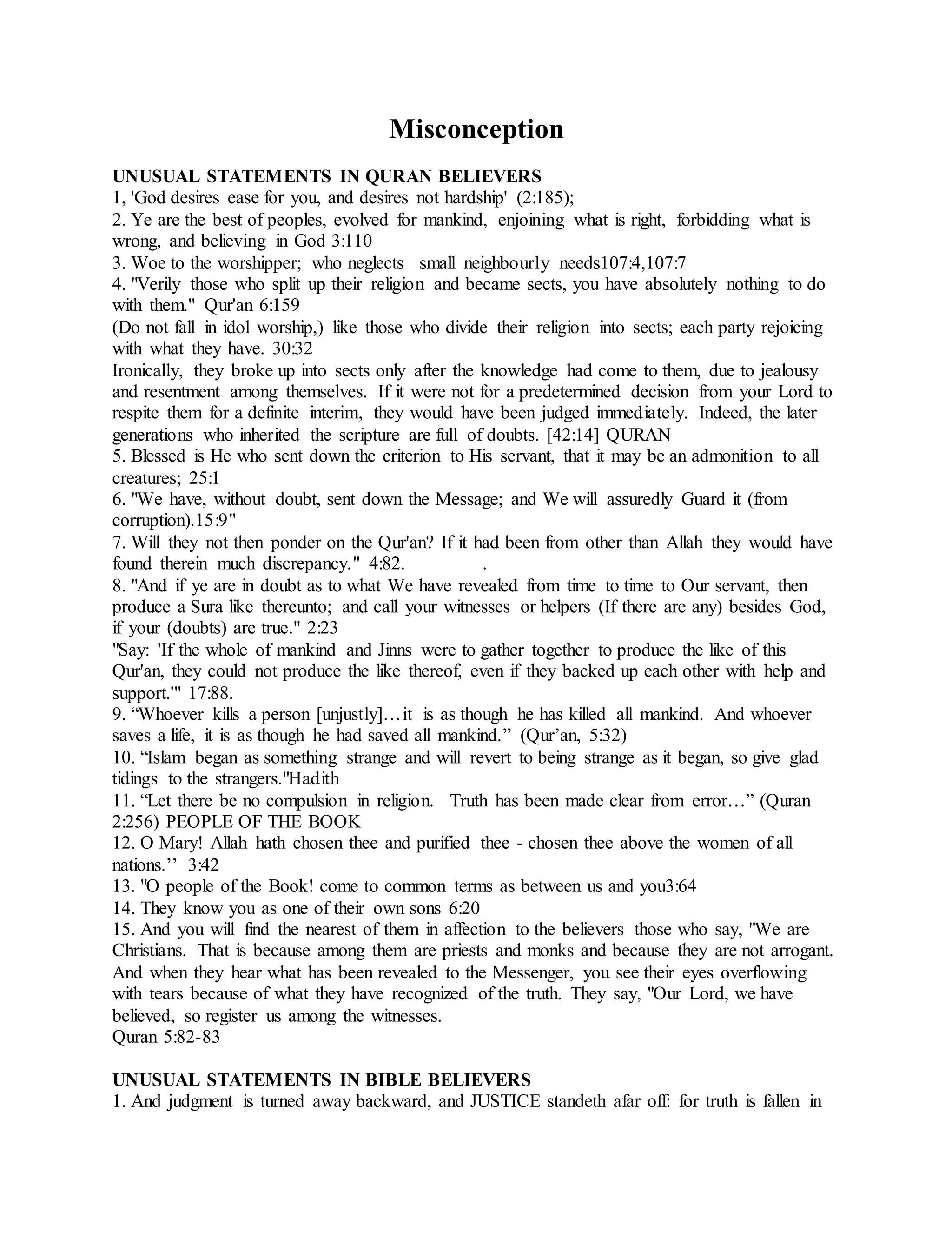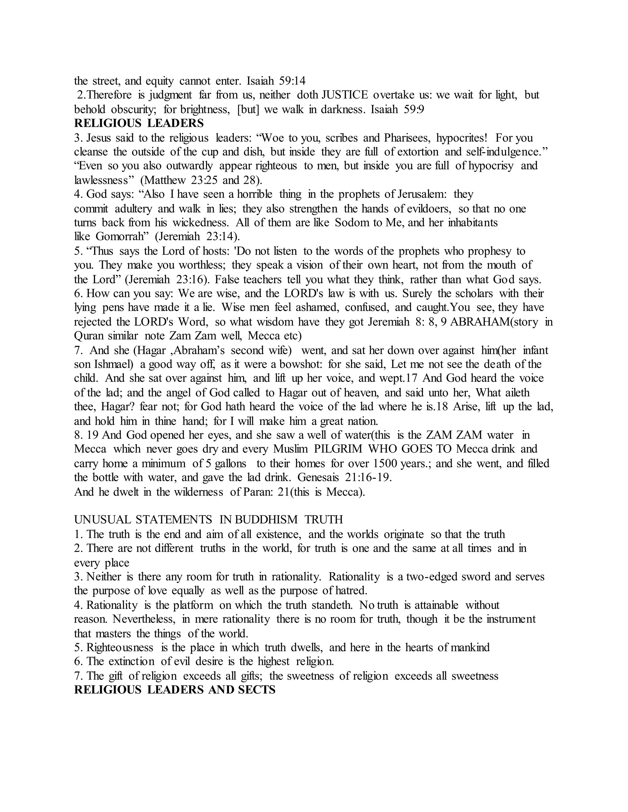 This document presents unusual statements from various religious texts including the Quran, Bible, and Buddhist teachings. It highlights passages about: