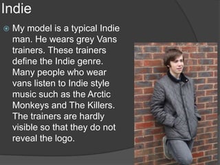 The document discusses the typical fashion choices of an "Indie" style, including grey Vans trainers, a Barbour jacket worn fully buttoned, and skinny jeans. These clothing items have become symbols of the Indie genre and conform to stereotypes so that viewers can easily relate to the style when seeing it in a magazine. The plain brick wall background was chosen to keep the setting simple and easy to edit.