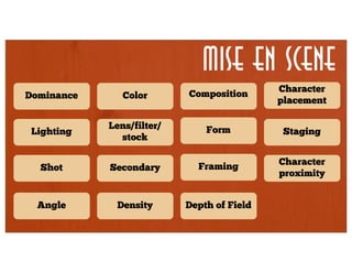 The document is about mise-en-scene elements used in the film Kill Bill Vol. 1. It discusses various aspects of mise-en-scene like lighting, camera angles, composition, color, character placement, shot types, depth of field, and framing. Each page focuses on one mise-en-scene element and provides examples from Kill Bill Vol. 1 to illustrate how that element was employed in the film.